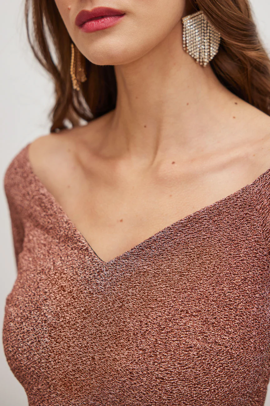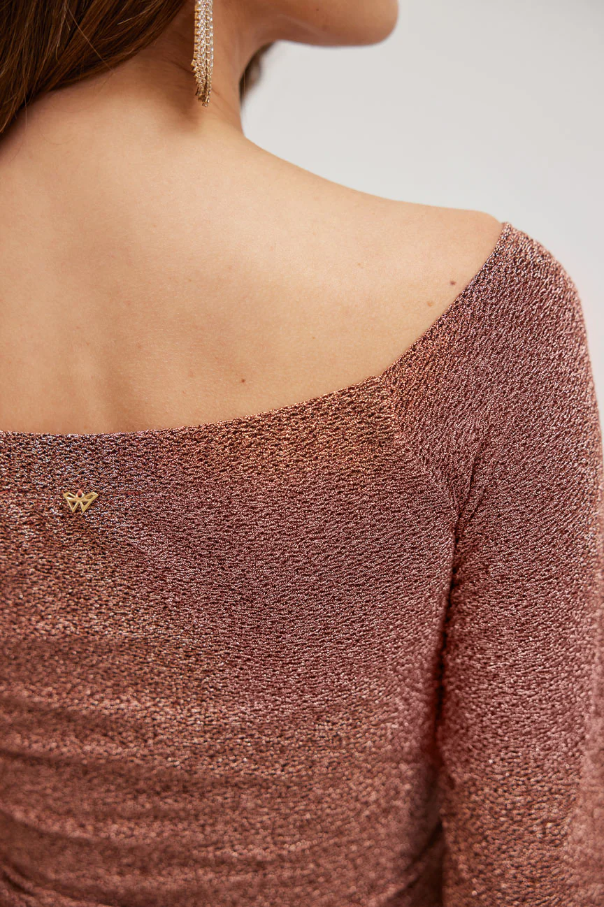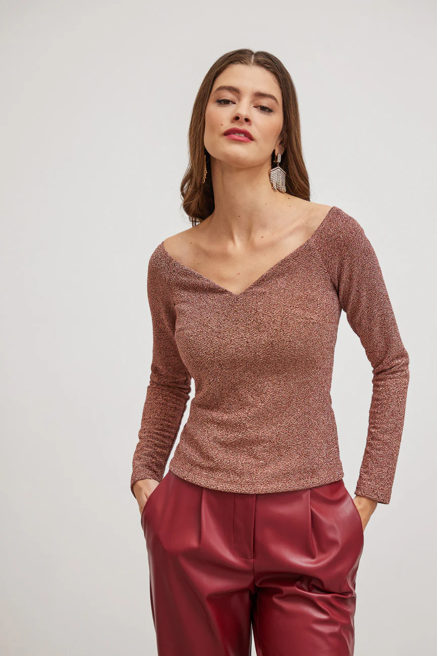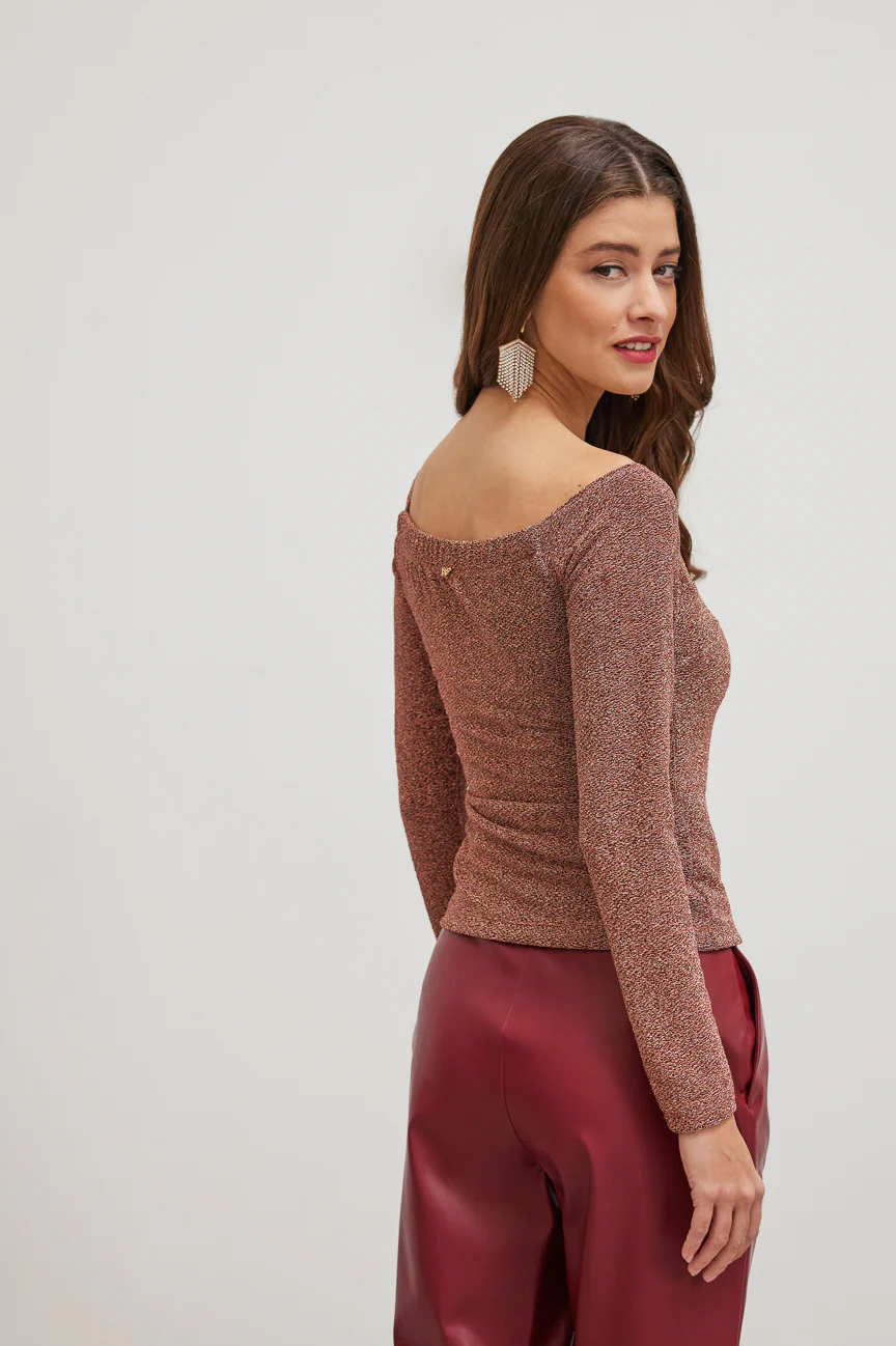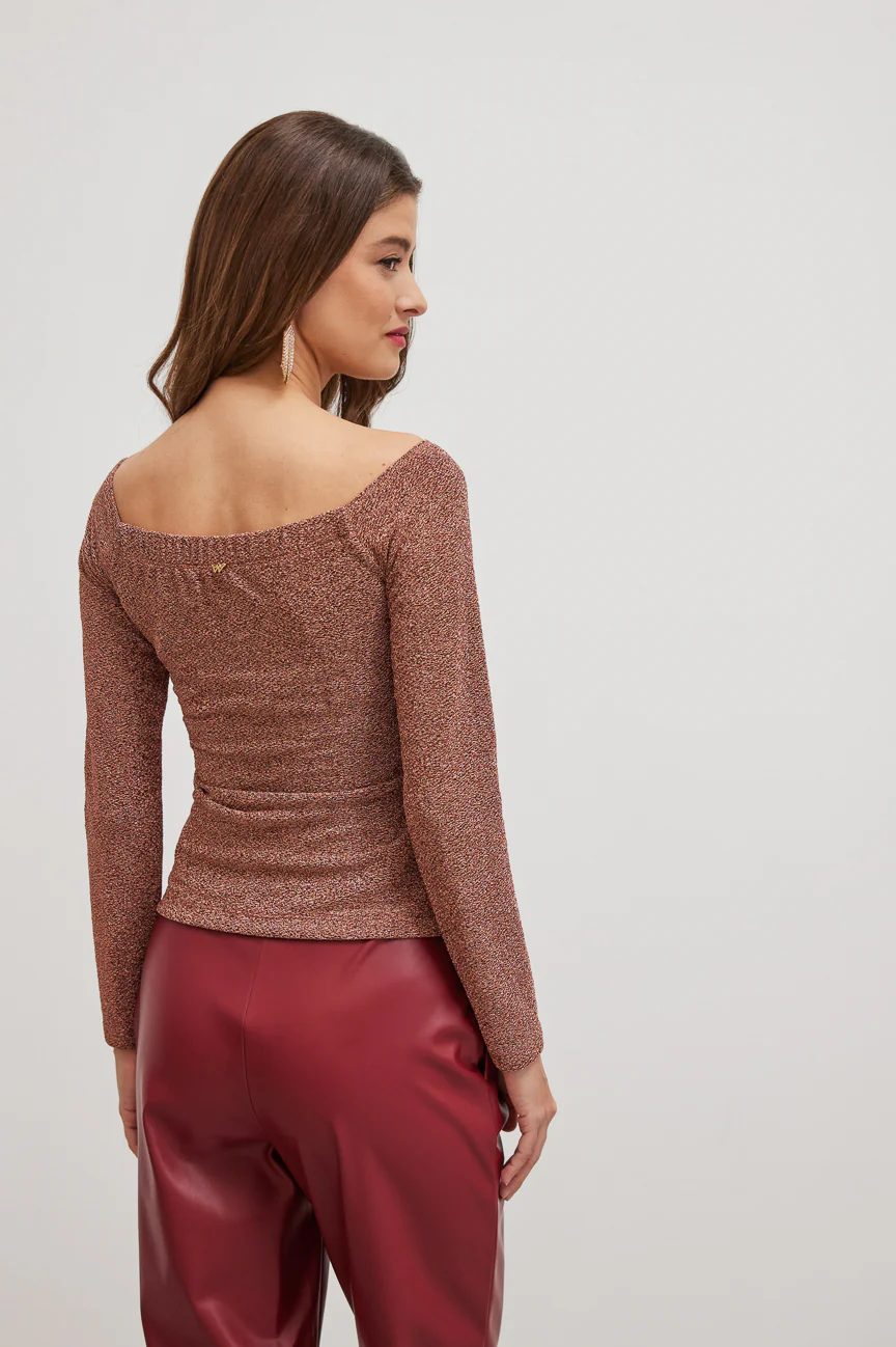 Long-sleeved, off-shoulder blouse.