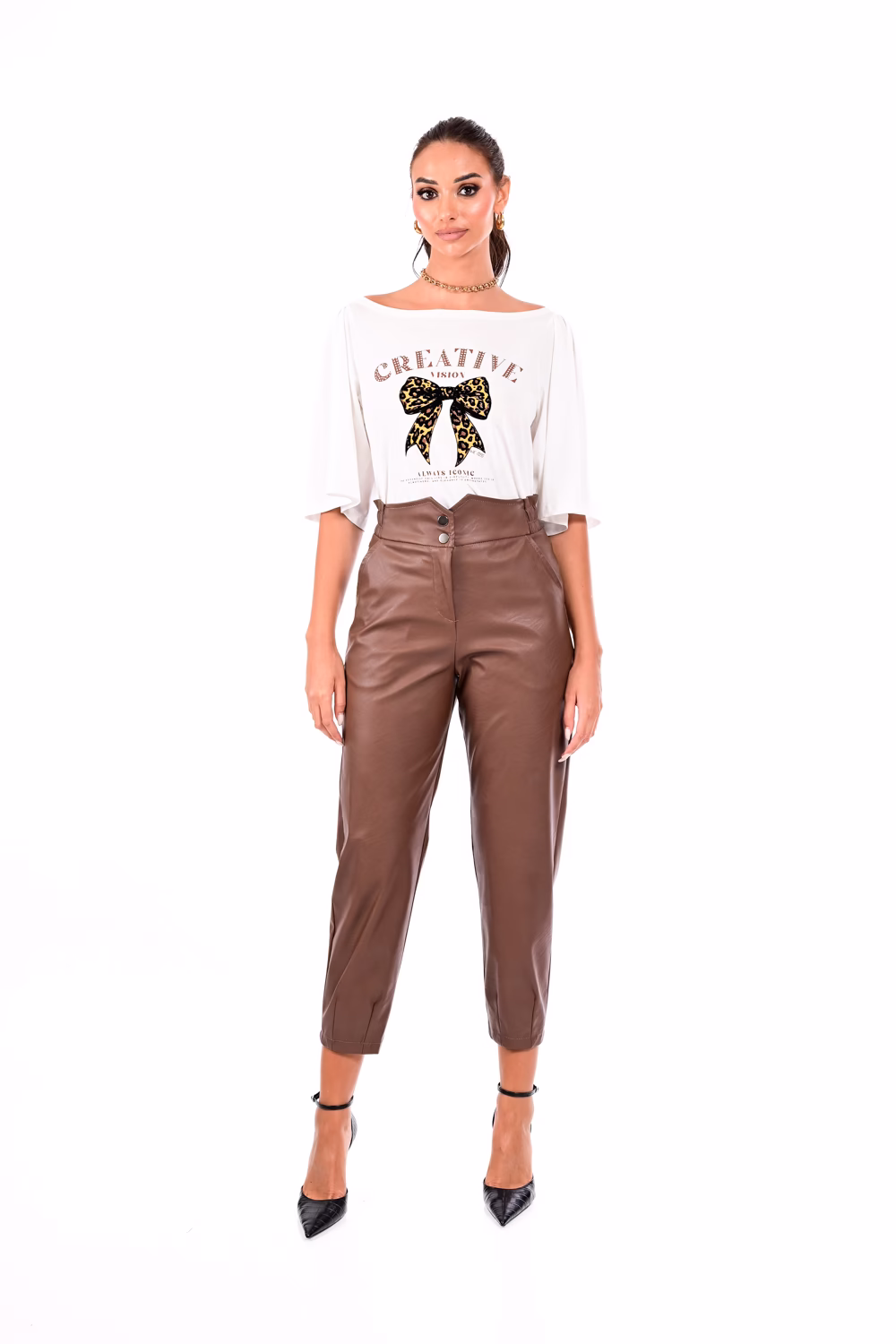 Pants made of soft eco leather, with a high waist and a modern design. It features an impressive elastic waistband with a double button and discreet pleats that highlight the silhouette. Its straight line makes it ideal for both morning and evening looks, easily combined with shirts or bodysuits for a chic result.