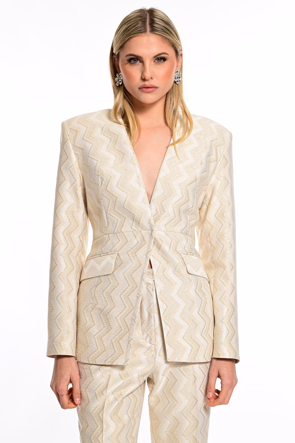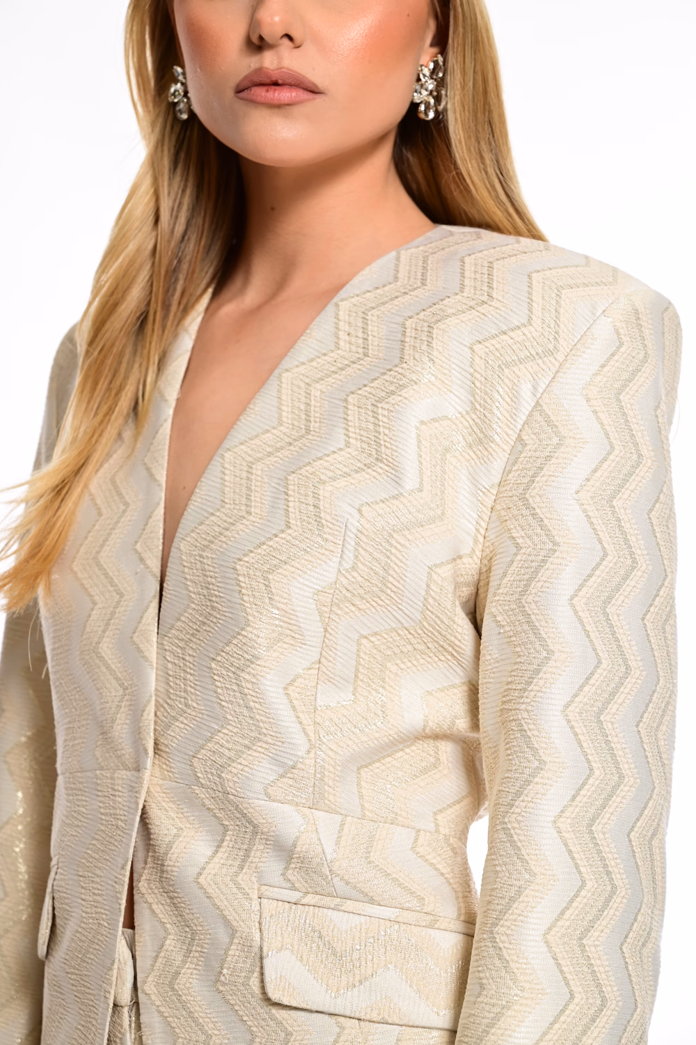 Κομψό γυναικείο σακάκι με ιδιαίτερη υφή και διακριτικό κυματιστό σχέδιο σε χρυσούς τόνους που αποπνέει πολυτέλεια και φινέτσα. Διαθέτει tailored γραμμή, κλασικό γιακά και κουμπί μπροστά, προσφέροντας άψογη εφαρμογή. Η υφή του υφάσματος δημιουργεί ένα μοναδικό παιχνίδι φωτός, καθιστώντας το ιδανικό για elegant και sophisticated εμφανίσεις. Συνδυάζεται άψογα με το matching σορτς για ένα ολοκληρωμένο και σύγχρονο σύνολο.